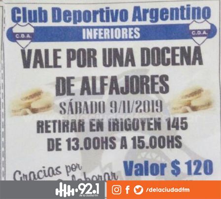 Los chicos de la entidad deportiva local venderán alfajores, la docena, a 120 pesos, en Irigoyen 145 de la ciudad.