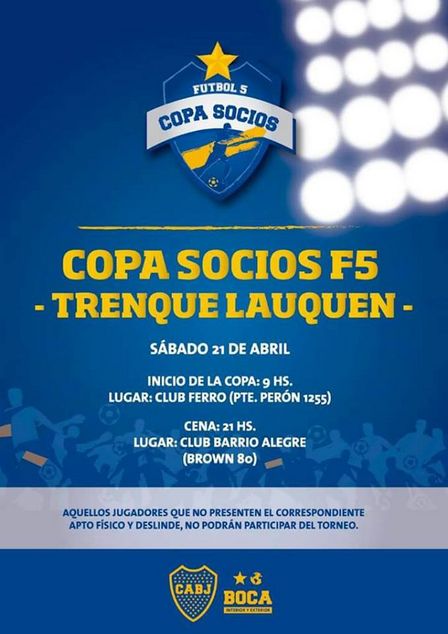 El mensaje dice "Xeneises Piguenses la Peña Dale BO! ha sido invitada a participar de la Copa Socios de Fútbol 5 organizada por el Departamento de Exterior e Interior del Club Atlético Boca Juniors el día Sábado 21 de Abril en la Ciudad de Trenque Lauquen.