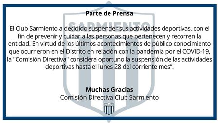 En un comunicado la entidad deportiva expresa que "el Club Sarmiento a decidido suspender sus actividades deportivas, con el fin de prevenir y cuidar a las personas que pertenecen y recorren la entidad.