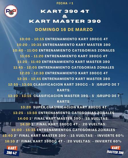 A las 10.00 horas darán inicio los entrenamientos para los karts 390 centímetros cúbicos, seguidos por las prácticas del kart Master, y por los ensayos de vehículos de las categorías zonales.