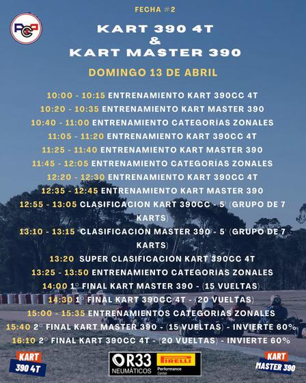 El Auto Club Pigüé, para el día domingo, confirmó la grilla de actividades previstas tanto para las categorías de kartings 390 centímetros 4 tiempos y Master como para las pruebas que tendrán varios pilotos de categorías zonales.