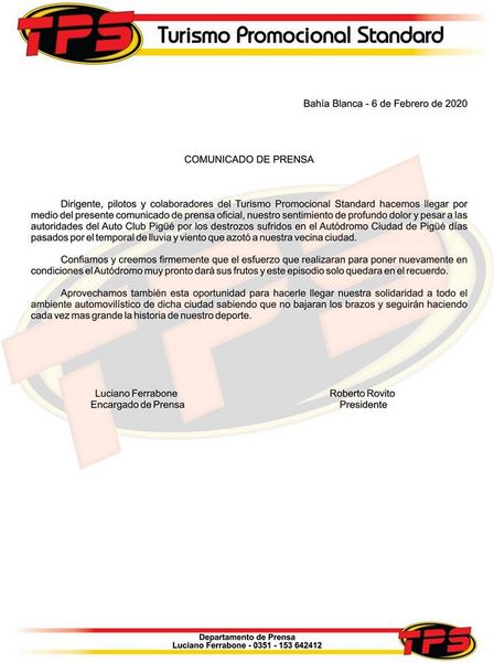 En un comunicado los dirigentes, pilotos, y colaboradores de la categoría zonal de automovilismo hicieron llegar su apoyo a la entidad pigüense.