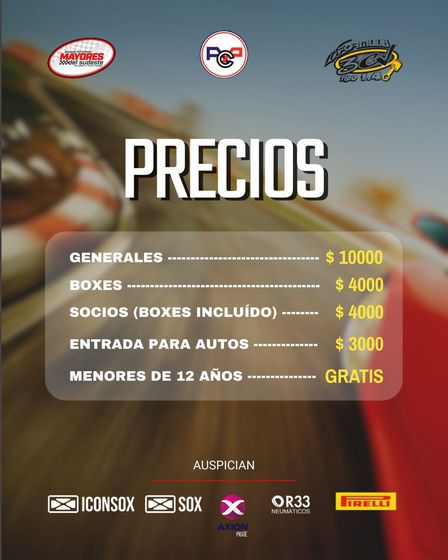La entrada general cuesta 10.000 pesos, a boxes el valor del acceso es de 4.000 pesos más, para socios con boxes incluído el costo es de 4.000 pesos, la entrada para autos es de 3.000 pesos, y los menores de 12 años de edad ingresan gratis.