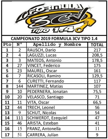 Darío Rausch es el líder con 217 puntos seguido por Lucas Laguzzi que cuenta con 208,5 y por Antonio Mateos que registra 178.5 unidades.