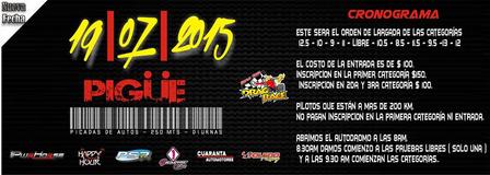 El domingo 2 se cerrarán las inscripciones a las 8:30hs, dando lugar a continuación a las 4 finales pendientes de la 5° Fecha en Coronel Suarez. (150cc Junior, 150cc Cadetes, 125cc Internacional y 200cc). Luego se disputarán las competencias correspondientes a la 6° Fecha del calendario 2015.