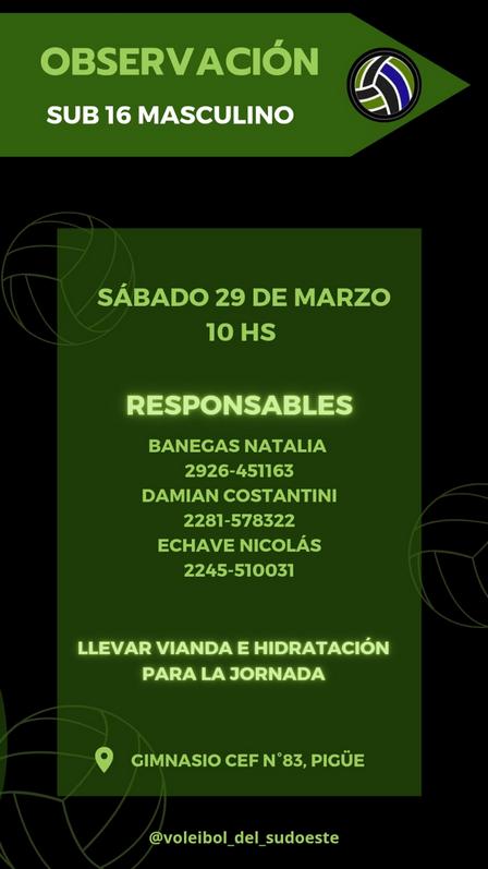 El sábado 29 de marzo se va a estar realizando una observación de jugadores en la categoría sub 16 Masculino para la Selección Bonaerense de Voleibol en la localidad de Pigüé.