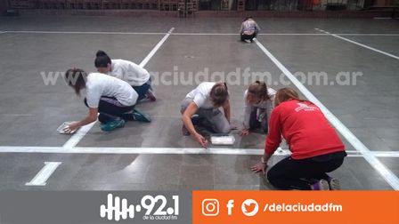 Las chicas de Voley del Club Unión estuvieron trabajando en el marcado de las canchas del salón.