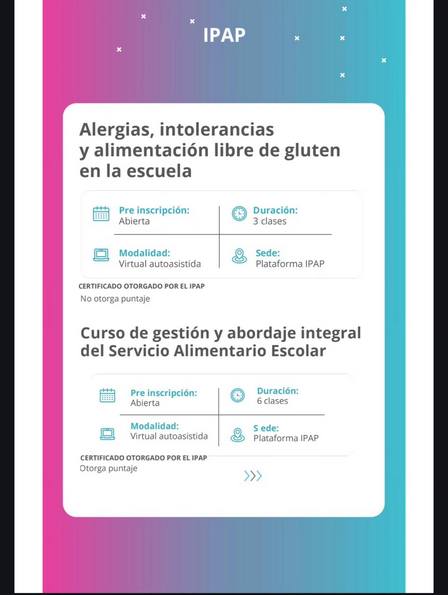 Se encuentran nuevamente abiertas las inscripciones para los cursos de 'Gestión y Abordaje Integral del Servicio Alimentario Escolar', y 'Alergias, Intolerancias y Alimentación Libre de Gluten en la Escuela', destinados a trabajadores auxiliares de Educación de la Provincia de Buenos Aires.