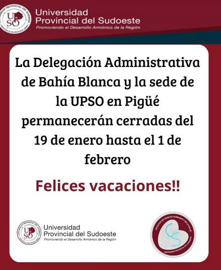 Cerrará la Sede de la Universidad Provincial del Sudoeste por el receso de vacaciones.