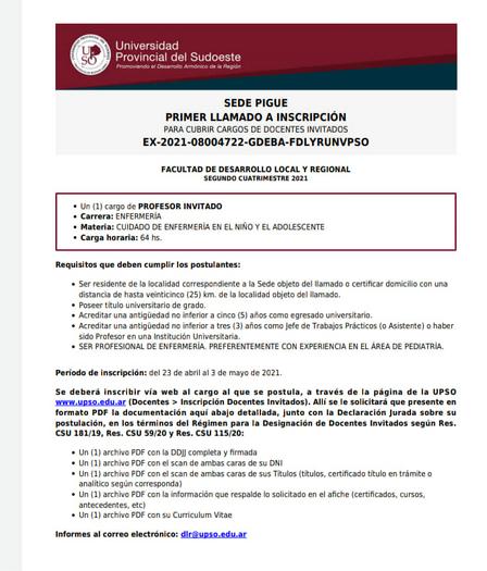 En la carrera de Enfermería son para Profesor invitado - Auxiliar invitado de la materia ‘Cuidado de enfermería en el niño y el adolescente’, para Profesor invitado de la asignatura ‘Cuidado de enfermería en salud mental’, y en la carrera de la Licenciatura en diseño industrial es el cargo de Profesor invitado para la materia de ‘Tecnología digital para el diseño II’