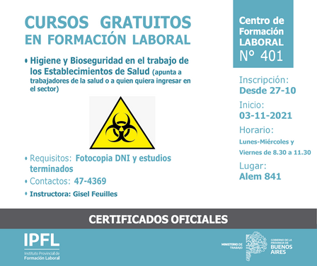El Centro de Formación dará un curso de 'Higiene y Bioseguridad en el trabajo en los establecimientos de salud'