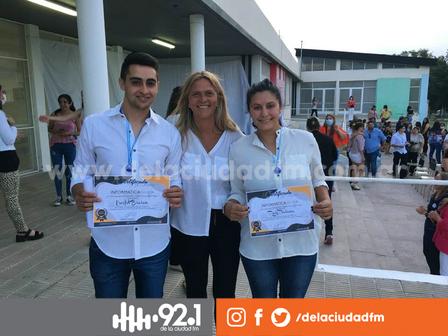 Fueron entregados 32 diplomas, aunque, por cuestiones vinculadas al distanciamiento social, en la imagen aparecen solo dos estudiantes.