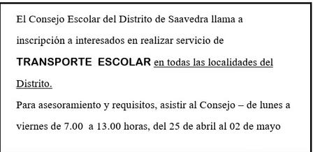 El Consejo Escolar se encuentra convocando a los interesados en ser proveedores de Transporte Escolar a inscribirse en sus oficinas.