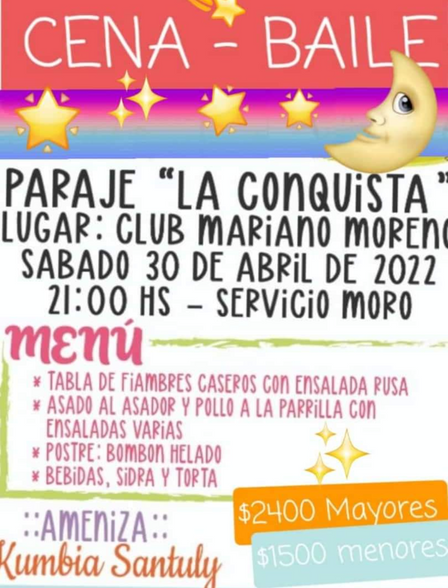 Tendrá lugar el sábado 30 de abril, será a partir de las 21.00 horas, con la presentación de Kumbia Santuli, en el Club Mariano Moreno.
