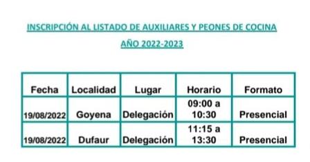 En Goyena, a partir de las 9.00 horas, y hasta las 10.30 horas, integrantes del Consejo Escolar, estarán inscribiendo a los interesados en ingresar al Listado de Auxiliares y Peones de Cocina 2022 / 2023.