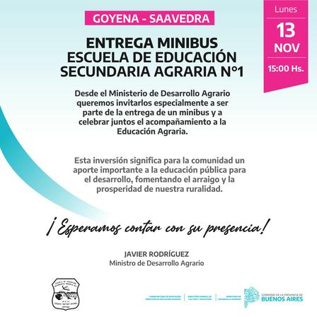 El parte de prensa que se difundió asevera “desde la Municipalidad de Saavedra (Pigüé) queremos manifestar nuestra alegría por la entrega del minibus a la Escuela de Educación Secundaria Agraria N° 1 de Goyena que se realizará el próximo lunes 13 de noviembre.