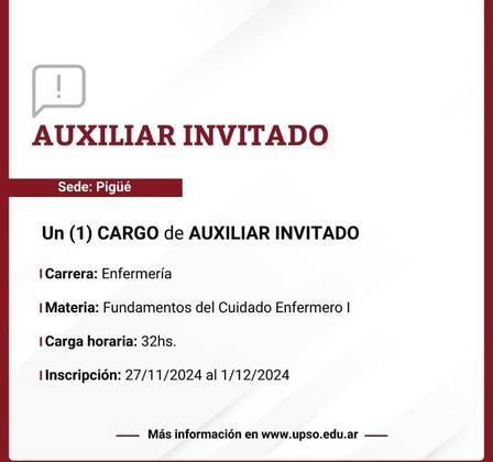 Para cubrir un cargo de Auxiliar Invitado en la Carrera de Enfermería está abierto el registro de la Materia Fundamentos del Cuidado Enfermero I en Pigüé.