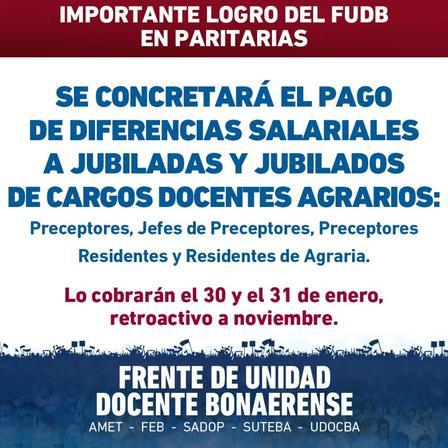 El comunicado de SUTEBA expresa que “este acuerdo paritario que viene trabajándose desde hace unos años, se vio concretado a fines del 2024 y será percibido por los jubilados con los haberes a cobrar el 30 y el 31 de enero retroactivo a noviembre”.