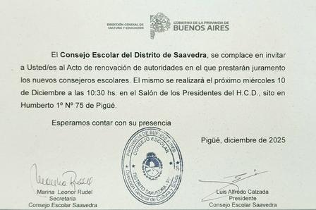 A las 10.30 horas, el día 10 de diciembre, en calle Humberto Primo 75 de Pigüé tendrá lugar el acto que viene siendo organizado por el Consejo Escolar.