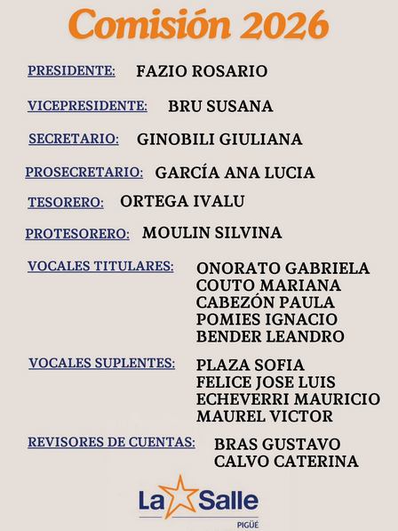 El Presidente es Rosario Fazio, la Vicepresidente Susana Bru, la Secretaria Giuliana Ginóbili, la Prosecretaria Ana Lucía García, la Tesorera Ivalú Ortega y la Protesorera Silvina Moulin.
