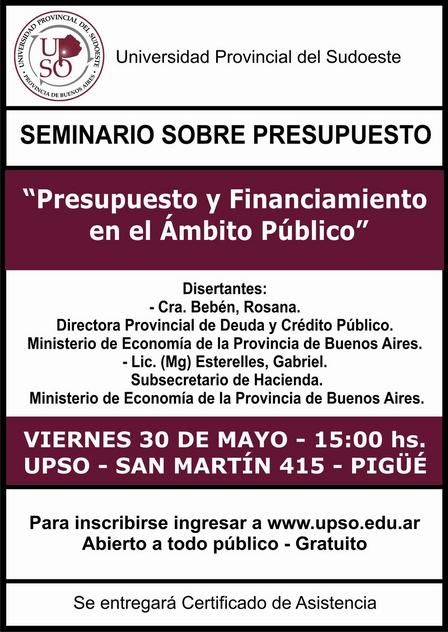 La Universidad Provincial del Sudoeste y el Municipio de Saavedra están convocando a participar del Seminario: "Presupuesto y Financiamiento en el Ámbito Público” a desarrollarse el viernes, desde las 15:00 horas, en la sede de la UPSO, ubicada en calle San Martín 415 de la ciudad de Pigüé.