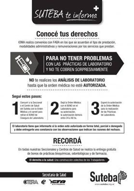 El parte de prensa de SUTEBA expresa que "es necesario que esté autorizada la Órden Médica para saber si corresponde o no el pago de algunas prácticas. No te realices los análisis de laboratorio sin la órden autorizada. Los reiterados reclamos de los afiliados por el cobro de determinadas prácticas de laboratorio, desmesurado en ocasiones, hace que resulte necesario aclarar los convenios que suscribe el IOMA para brindar las prestaciones correspondientes y el sistema de autorización de las prácticas de laboratorio.
