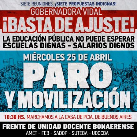 En consecuencia: EL FRENTE DE UNIDAD DOCENTE BONAERENSE RECHAZA CATEGÓRICAMENTE LA PROPUESTA SALARIAL A LA BAJA QUE VUELVE A PRESENTAR EL GOBIERNO".