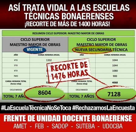 El mensaje advierte sobre lo que el Frente Gremial Docente Bonaerense califica de recorte para las Escuelas Técnicas de la Provincia.