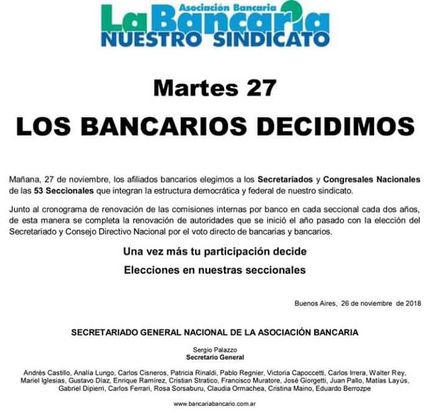 Este martes tendrán lugar elecciones internas en las seccionales del gremio de los bancarios.