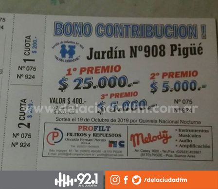 El bono cuesta 400 pesos o dos cuotas de 200 cada uno sorteando el 19 de octubre por la Quiniela Nacional Nocturna.