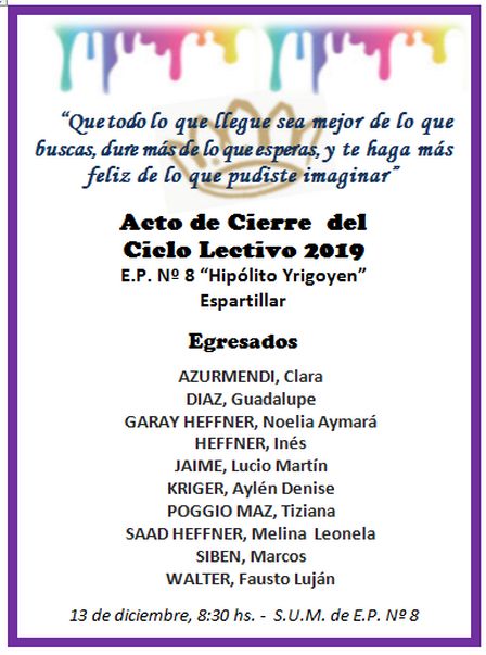El acto de fin de ciclo lectivo de la Escuela 8 se hará la semana próxima, más precisamente el viernes 13 de diciembre, a partir de las 8.30 horas en el Salón de Usos Múltiples.