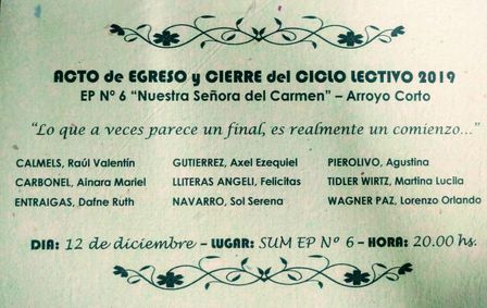 Este jueves, desde las 20.00 horas, tendrá lugar la presentación del acto de fin de ciclo lectivo de la Escuela Pública Número 6 de Arroyo Corto.