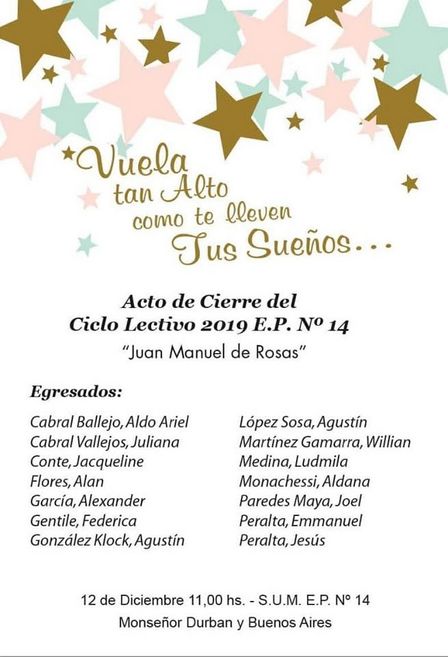 Tendrá desarrollo esta mañana el acto de fin de ciclo lectivo de la Escuela 14 Juan Manuel de Rosas.
