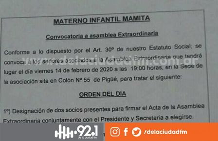 El Materno Infantil Mamita convoca a una asamblea para conformar la nueva Comisión Directiva.