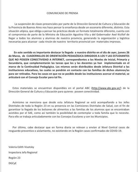 La Inspectora Jefa Distrital de Educación dio a conocer un comunicado