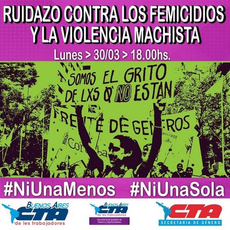 El mensaje dice “desde CTA te convocamos a ser parte del ‘Ruidazo contra los femicidios y la violencia machista’, del día lunes 30 de marzo, a las 18.00 horas”.