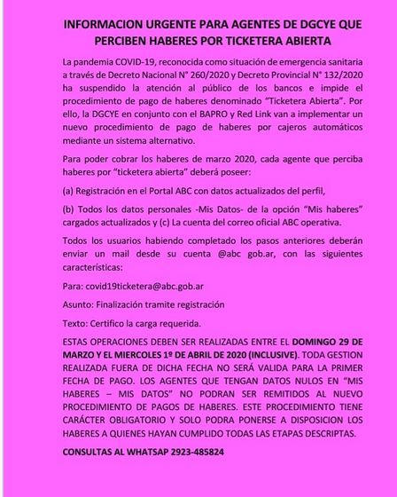 Ante la suspensión de la atención al público de los bancos los agentes que cobran sus haberes por ticketera abierta podrán contactarse con el Consejo Escolar del Partido de Saavedra.