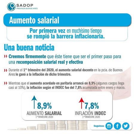 El informe presentado en las redes por SADOP Pigüé expresa que “luego de 4 años donde el salario corrió de atrás a la inflación, para apenas empatarle con la clausula gatillo, durante el primer trimestre del 2020 el aumento salarial docente en la Provincia de Buenos Aires la superó.