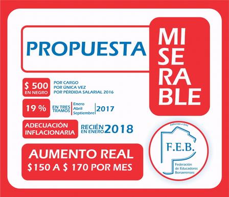El comunicado del Frente Gremial Docente asevera que “ante la propuesta irresponsable del Gobierno Provincial, nuevamente del 19% en tres cuotas, los seis gremios docentes bonaerenses rechazaron al unísono esta oferta descalificadora.