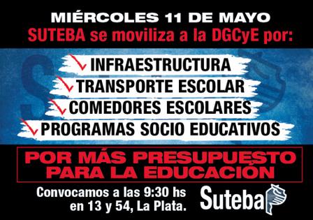 El SUTEBA se movilizará el miércoles 11 a la DGCyE, en La Plata, por la resolución de problemáticas en infraestructura, transporte escolar, comedores, y programas socioeducativos