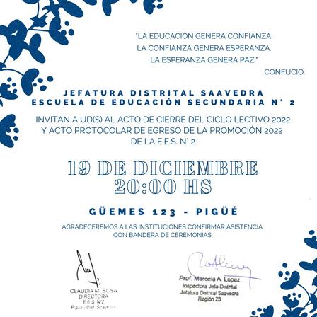 La Escuela de Educación Secundaria N° 2 está convocando al acto centralizado de cierre del ciclo lectivo 2022 y acto protocolar de egreso de las promociones de Bachilleres en Economía y Administración y Bachilleres en Ciencias Sociales.