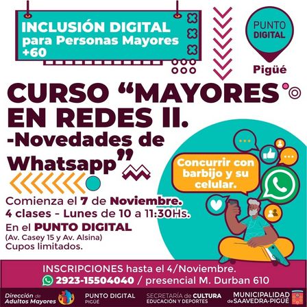Para trabajar en la inclusión digital de los adultos mayores estarán desarrollando esta capacitación prevista para el lunes 7 de noviembre, de 10.00 a 13.00 horas, en el Punto Digital.