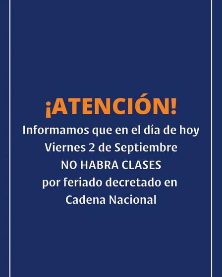 El comunicado dice 'Informamos que en el día de hoy, viernes 2 de septiembre, no habrá clases, por el feriado decretado en Cadena Nacional'.