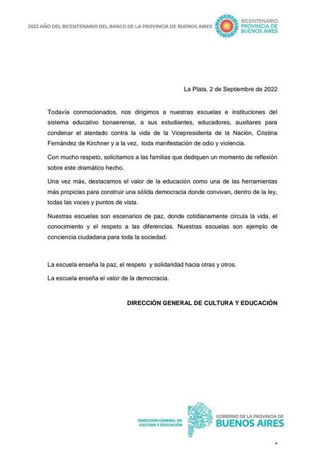 Se trata del pronunciamiento de la Dirección General de Cultura y Educación respecto de los hechos de público conocimiento del día 1° de septiembre de 2022".