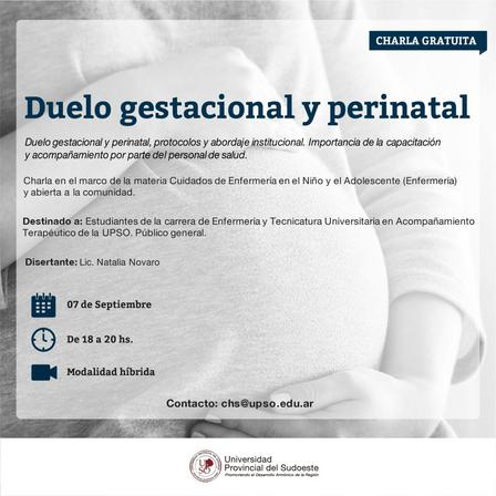 El miércoles 7 de septiembre se realizará una charla gratuita sobre 'Duelo gestacional y perinatal', en el marco de la materia Cuidados de Enfermería en el Niño y el Adolescente, en la UPSO.
