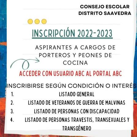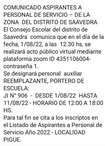 El Consejo Escolar del Distrito de Saavedra comunicó que en el día de la fecha, jueves, 4 de agosto, desde las 10.00 horas, se realizará acto público virtual mediante plataforma zoom ID 4351106004 - Contraseña 1.