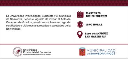 Programan un Acto de Colación, para el día 28 de diciembre, a las 11:00 horas, en la Sede de la UPSO de Pigüé.