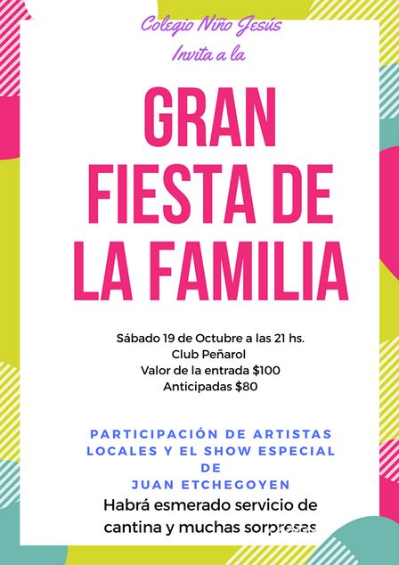 El encuentro, organizado por el Colegio Niño Jesús, tendrá un valor de las tarjetas anticipadas a 80 pesos, en el salón costarán 100 pesos, y está prevista la participación de artistas locales y el show de Juan Etchegoyen.