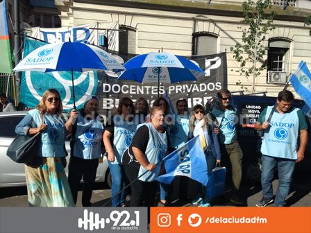 Miembros del gremio docente marcan presencia, en la reunión por las paritarias, frente al Ministerio de Economía Bonaerense.