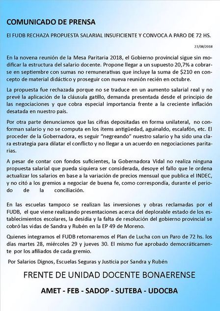 El comunicado del Frente Gremial indica que "en la novena reunión de la Mesa Paritaria 2018, el Gobierno provincial sigue sin modificar la estructura del salario docente. Propone llegar a un supuesto 20,7% a cobrarse en septiembre con sumas no remunerativas que incluye la suma de $210 en concepto de material didáctico y proseguir con nueva reunión recién en octubre.